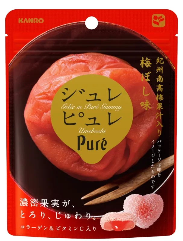 カンロは、これまで多くの“梅”をテーマとした商品を発売し、ロングセラーとして定着させてきました。のど飴のロングセラー『健康梅のど飴』や、素材の美味しさをそのまま味わえる『まるごとおいしい干し梅』『茎わかめ梅味』などが定番品です。しかし、カンロが展開している“グミ”の領域において、これまでは“梅”をテーマとした商品で定番となるものはございませんでした。“梅”の菓子は、お客様から非常に支持されているフレーバーで、グミとの相性も非常に良いです。今回は、「ジュレピュレ」がもつ独自のセンターイン製法(とろり、じゅわり)を活用して、ついにカンロならではの、納得の“梅”グミの発売にいたりました。ありそうでなかったピュレグミブランドの“梅ぼし味”をお楽しみいただけましたら幸いです。