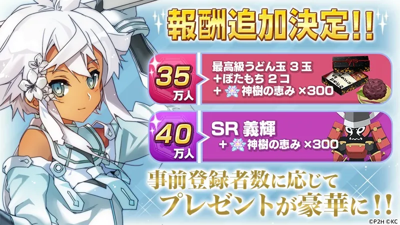 35万人突破で「最高級うどん玉3玉」「ぼたもち2コ」「神樹の恵みx300」、40万人突破で「SR 義輝」「神樹の恵みx300」をプレゼントいたします。この機会に是非、ご登録ください!