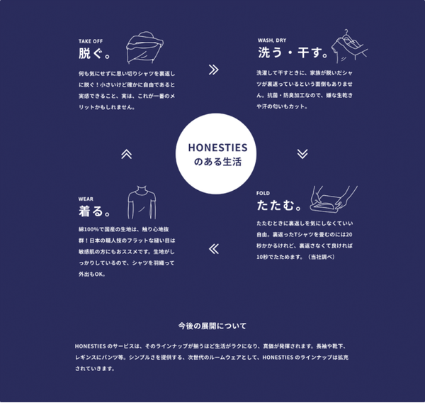 忙しい子育て世代やビジネスパーソン、医療や介護、障害者をターゲットに、インナーから「裏表と前後」をなくすことで、洗濯物をたたむ時間を減らし、着脱時の注意力を軽減することで、シンプルで豊かなライフスタイルを提供する。