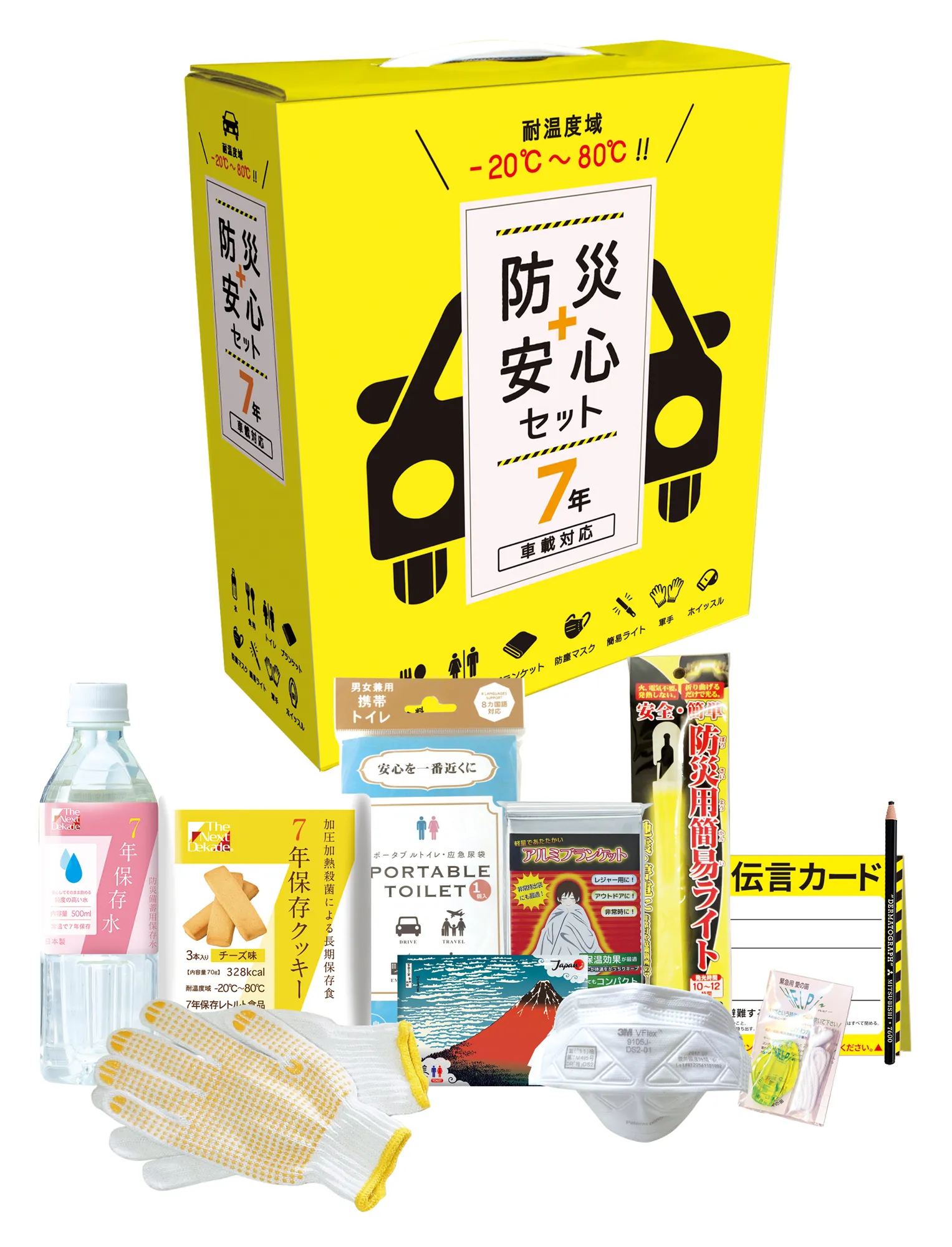 取っ手の付いたコンパクトなボックスの中に、計10点の厳選された防災用品が入っています。車載用としては業界初の耐温度域-20℃~80℃に対応した水・食料が入ったセットとなっており、環境の変化が激しい車内でも安心です。災害時に車を置いて避難する場合に、連絡先を記入しダッシュボードなどに置いていく伝言カードも付属されています。5ヵ国語対応(英語、中国語、韓国語、ポルトガル語、日本語)で在日・訪日の外国人のお客様も安心。震災や豪雪など「もしも」の時に必要なアイテムが入った、今までにない車載用の防災セットです。