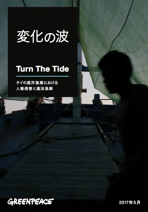 国際環境NGO グリーンピース・ジャパン(東京都新宿区、以下グリーンピース・ジャパン)は、本日5月11日(木)、日本語版レポート「変化の波ータイの遠洋漁業における人権侵害と違法漁業」を発表しました(注1)。本レポートは、グリーンピース・東南アジアがタイの水産業にはびこる人権問題について12カ月間にわたる独自調査を行い、2016年12月15日に発表しました。漁獲した魚を海の上で運搬船に移し替える行為(洋上転載)と人身売買や強制労働などのつながりを明らかにしています。洋上転載をすることで、船は長期間にわたり港に戻らずに漁を続けることが可能になり、その孤立した環境が人権侵害や違法漁業を助長させています。