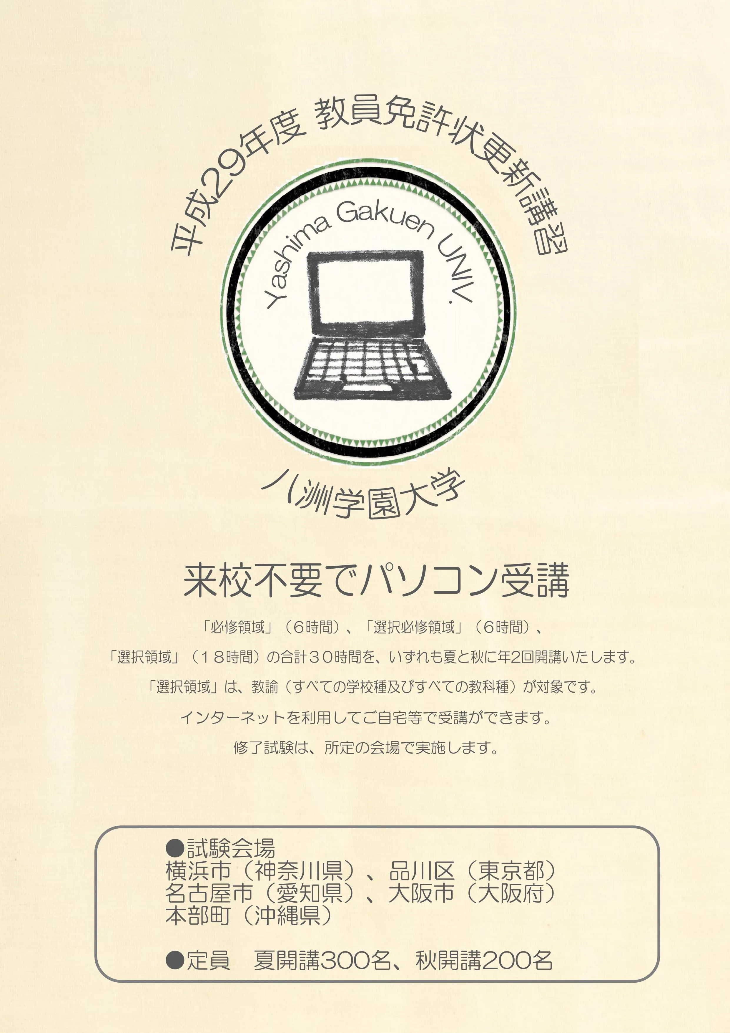 2017年5月12日 15:00通信制の八洲学園大学(所在地:神奈川県横浜市、学長:和田 公人、運営:学校法人八洲学園)は、自宅のパソコンで受講可能な「eラーニング教員免許状更新講習」を2017年度も実施します。