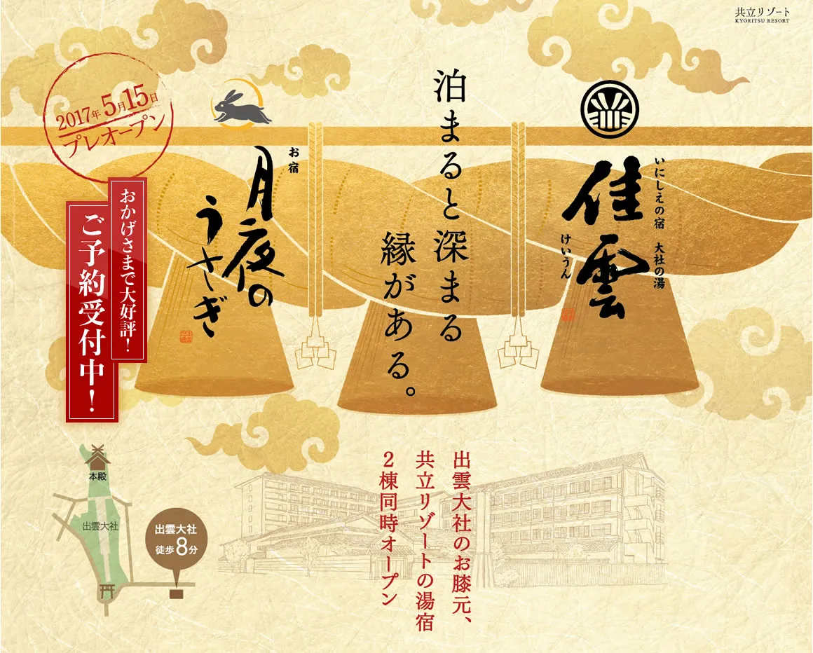 2017年5月12日 12:30 学生寮・社員寮及びビジネスホテル『ドーミーイン』やリゾートホテルを日本全国で展開する株式会社 共立メンテナンス(本社:東京都千代田区、代表取締役社長:上田 卓味)は、島根県出雲市の出雲大社至近に「いにしえの宿 大社の湯 佳雲」ならびに「お宿 月夜のうさぎ」を2棟同時にオープンします。出雲大社の新緑がより一層美しくなる5月15日(月)~6月17日(土)をプレオープン期間として、宿泊申込の受付を開始しています。