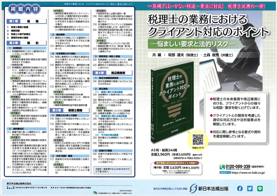 新日本法規出版株式会社(所在地:愛知県名古屋市中区栄1丁目23番20号、代表取締役:星謙一郎 (https://www.sn-hoki.co.jp/))は、「税理士の業務における クライアント対応のポイント-悩ましい要求と法的リスク-」を2024年5月24日に発売いたしました!
