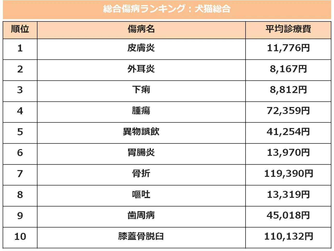請求件数が最も多い傷病は、「皮膚炎」となり、以下「外耳炎」、「下痢」と続きました。これらが上位になった理由としては、飼い主が症状に気づきやすい為、受診につながったことや、どの年齢の犬猫もかかりやすい傷病であることが挙げられます。ちなみに、請求件数では第7位の「骨折」の平均診療費が119,390円と上位10位以内で最高額となりました。