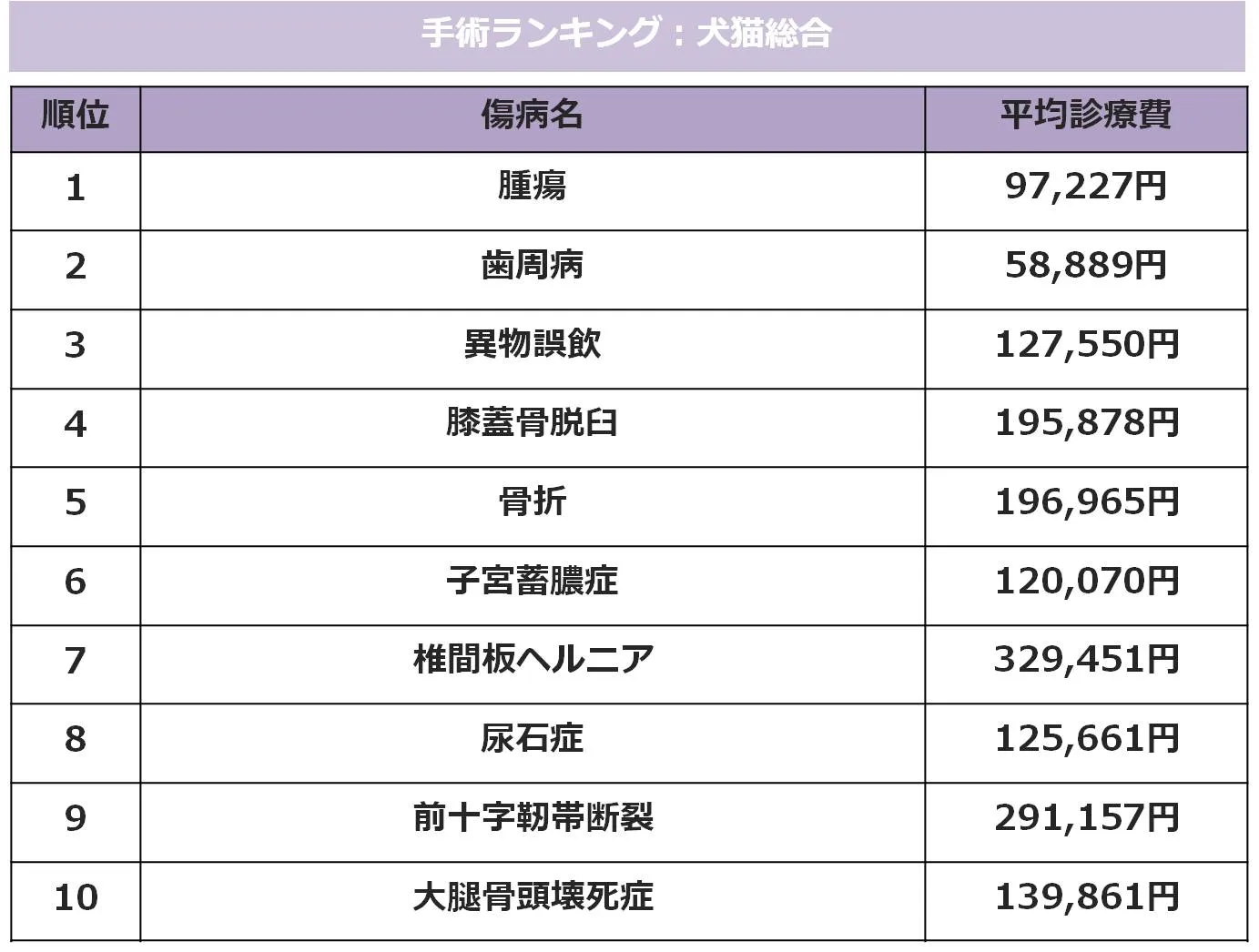 ・手術ランキング(犬猫、年齢不問)で平均診療費が最高額となったのは