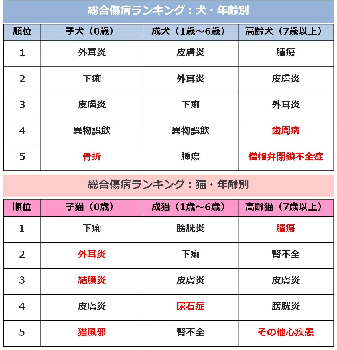 調査結果4:総合傷病ランキング(犬猫、年齢毎)