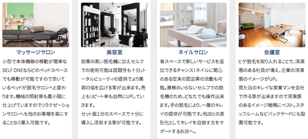 スタッフによる技術の差がなく、照射の安全性に徹底し脱毛機SELF ONEだからこその今までにない新しいサービスを提供する事が可能です。