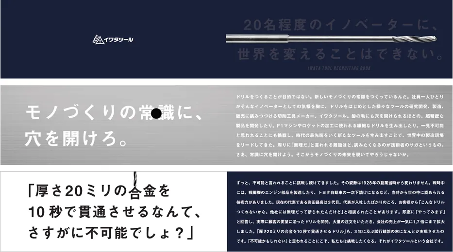 入社案内では『モノづくりの常識に穴を開けろ。』をコンセプトに、企業姿勢・技術力の高さを表現。各ページのキャッチコピーで一般的なメーカーでの常識を提示し、イワタツールが「それを変えてきている」実績を紹介しています。