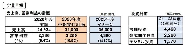 定量目標は、2023年度の中期実行計画として、売上高3兆1,000億円、営業利益率10.5%とし、さらなる事業拡大に向け、8,000億円を超える投資を実行します。また、2025年度にありたい姿として、売上高3兆6,000億円、営業利益4,300億円(営業利益率約12%)をめざします。