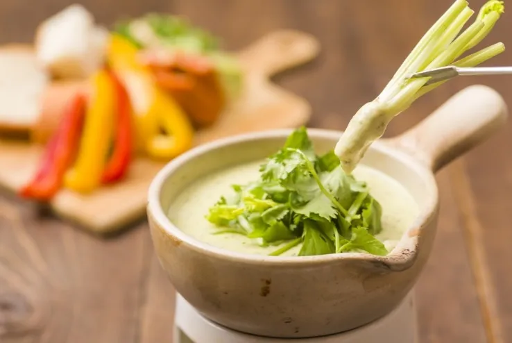 スイスなどのアルプス山岳部やその周辺地域の家庭料理である「チーズフォンデュ」にパクチーペースト等を加えた緑色のチーズソースを開発しました。パクチーの茎とチーズソースの相性が良く、特にパクチー好きの方にオススメの一品です。