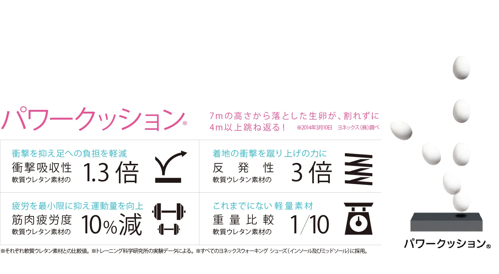 当社最大の機能である「パワークッション」は、7mの高さから生卵を落としても割れずに4m以上跳ね返す衝撃吸収力と反発力を併せ持つ「軽く、疲れにくい」衝撃吸収素材です。そのパワークッションをインソール部分全体に加えミッドソールの踏みつけ部分と踵にも搭載し、足への衝撃緩和と歩き出しやすさをサポートします。