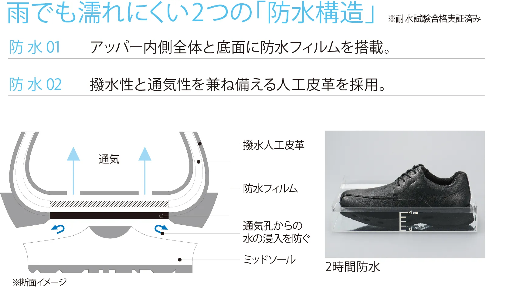 更に当社独自のドライブリーズ(通気防水シート)を底面に使用し、アッパーには透湿防水フィルムを内包する事で、雨の日でも快適な「防水構造」としました。