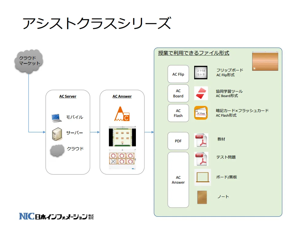 2017年5月16日 15:00日本インフォメーション株式会社(本社:名古屋市千種区今池、代表取締役社長:加藤 高章)は、同社の教育機関向けアプリACシリーズをバージョンアップし授業支援アプリ「AC Answer」と他のACシリーズ製品「AC Flip」「AC Board」「AC Flash(新製品)」がシームレスに資料連携できるようになりました。