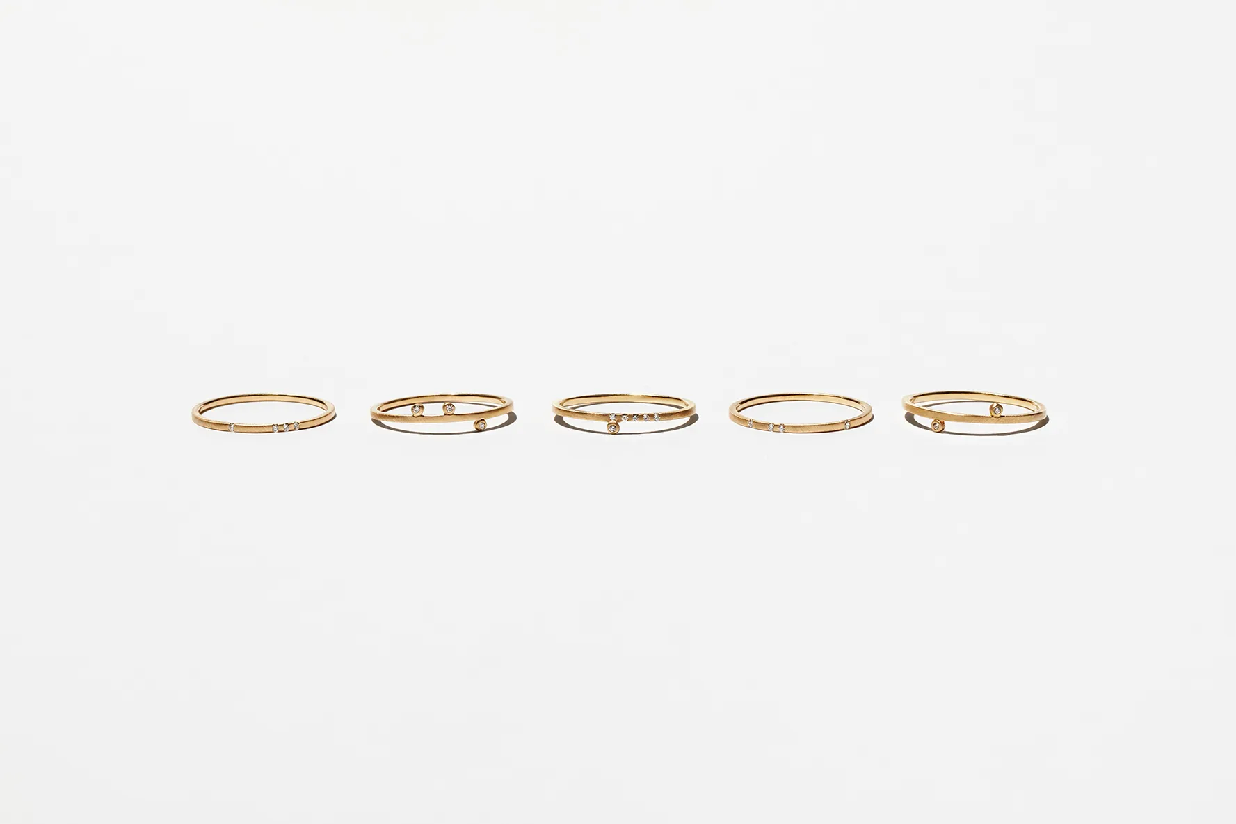 ランダムにメレダイヤモンドをセッティングした5つのリング。上にしたり、下にしたり、向きや組み合わせの順番を変えて、様々な表情をお楽しみいただけます。自分だけのお気に入りの組み合わせを見つけ、一つひとつコレクションする楽しみを与えてくれるコレクションです。