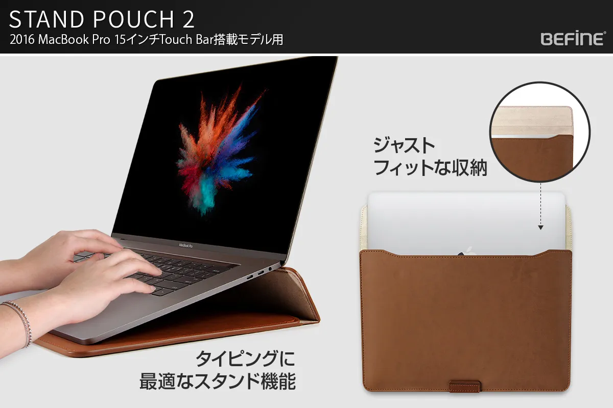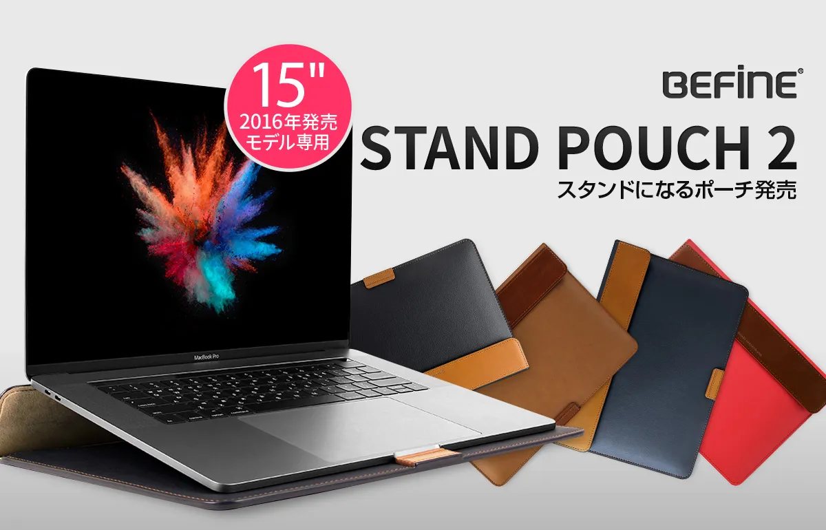 モバイルケース・アクセサリー専門の株式会社ロア・インターナショナル(所在地:東京都新宿区、代表取締役社長:Ally Won)は、BEFiNE(ビファイン)のApple MacBook Pro 15インチ(2016, 15インチTouch Bar搭載モデル)専用ポーチ「STAND POUCH 2」の販売を開始しました。本製品は本革のポイントがおしゃれなデザインに加え、収納とスタンドの2つの機能を兼備した、スマートで快適なMacBookライフを提供するポーチです。