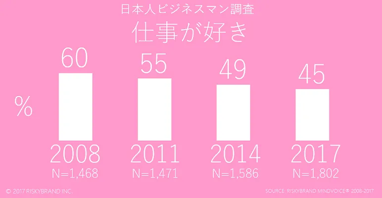 このデータをみると、仕事が「好き」または「まあ好き」と答えたビジネスマンは2008年では60%だったのが、2011年では55%、2014年では49%、2017年では45%と、この9年で15ポイント減少しました。