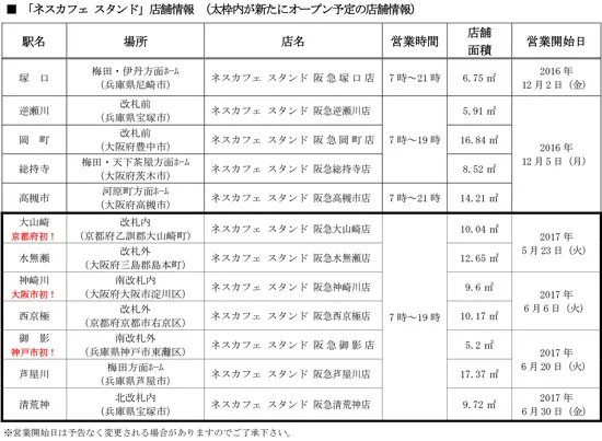 「ネスカフェ スタンド」の誕生以降、ご利用になる多くのお客様から、阪急沿線各駅への新規出店を望む お声をいただいたことを受けて、このたび新たに7駅でオープンします。