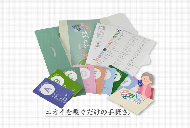 「もの忘れアルかなチェック はからめ」とは、認知症の発症リスクを超早期の段階で簡単・気軽にセルフチェックできるキットです。認知症と嗅覚の関係は広く知られおり、本キットは、認知症に関係の深いニオイのカード10枚をこすり、どんなニオイを感じたかを選択肢制の解答用紙にチェックし、同封の返信用封筒でお送りいただくだけで10日程で結果レポートが届きます。