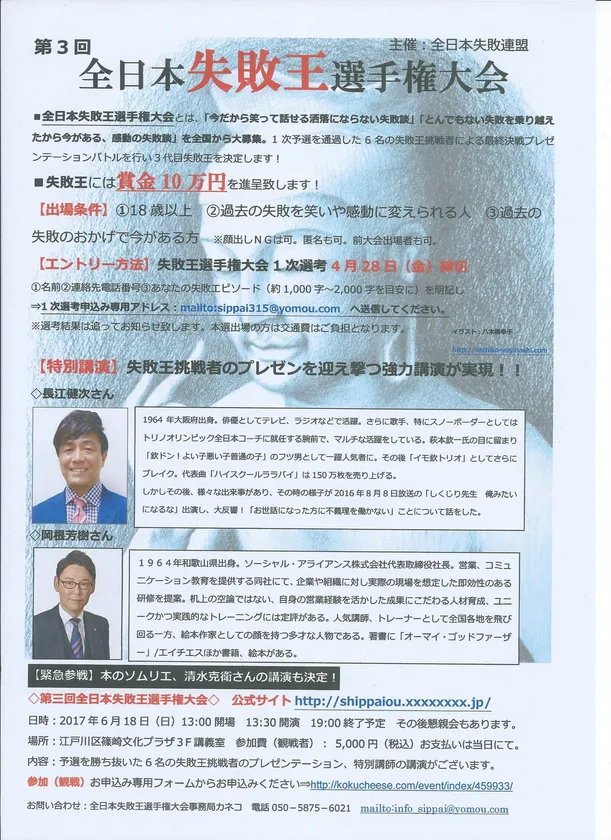全日本失敗連盟(運営事務局所在地:東京都江戸川区、代表:金子章太郎、以下 全失連)は、イベント「第3回全日本失敗王選手権大会」を2017年6月18日(日)に東京・江戸川区 しのざき文化プラザにて開催いたします。全国から寄せられた失敗談から、厳正なる審査で6名の出場が決定。過去の大会で一番多い応募数となりました。