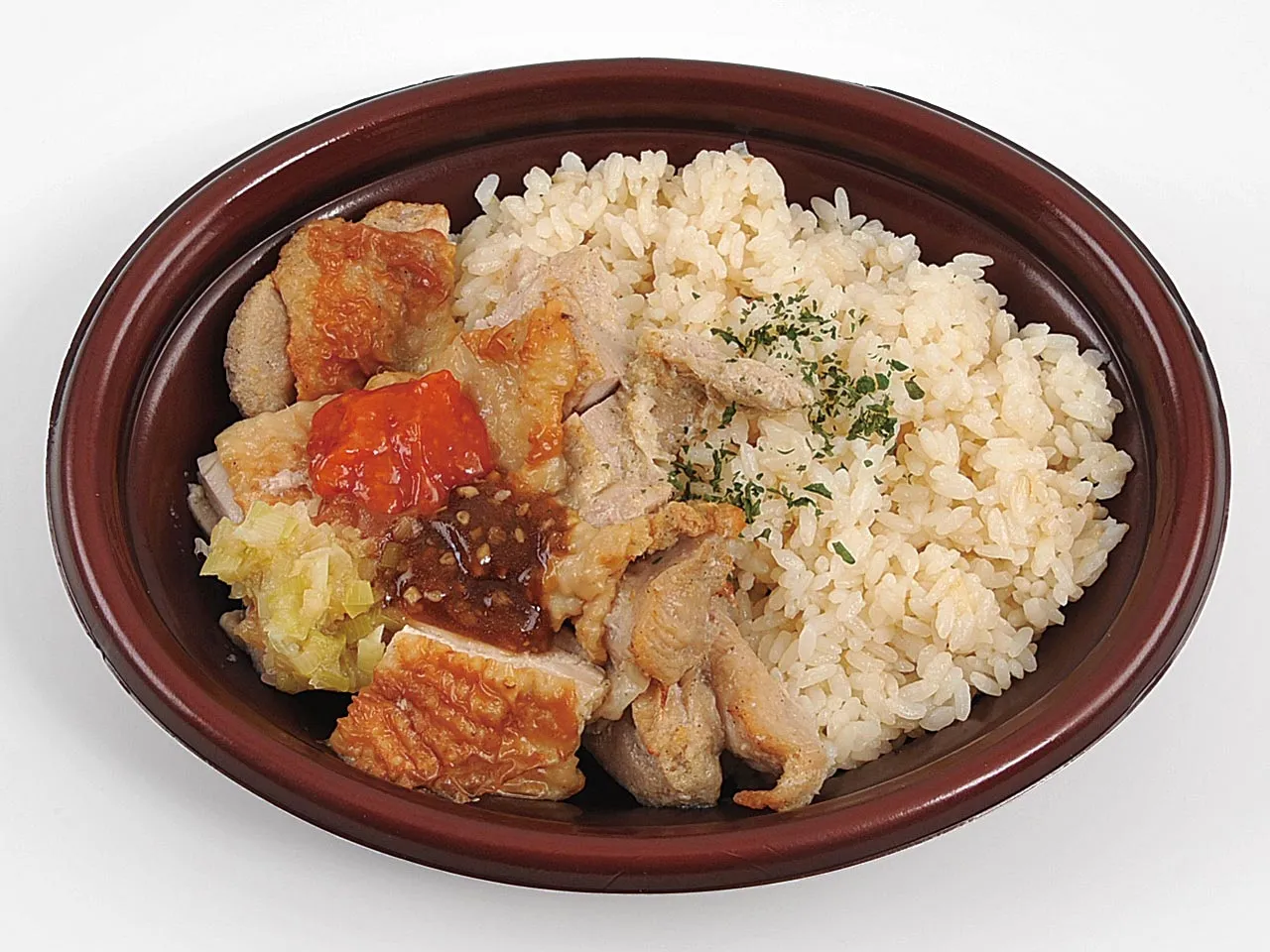 丸鶏スープと生姜で炊いたごはんに、やわらかな食感に仕上げたチキンをのせサンバルソース、焦がし感のあるソイソース、生姜ねぎたれの3種のソースをかけた、シンガポール名物あっさり風味のピリ辛チキンライスです。
