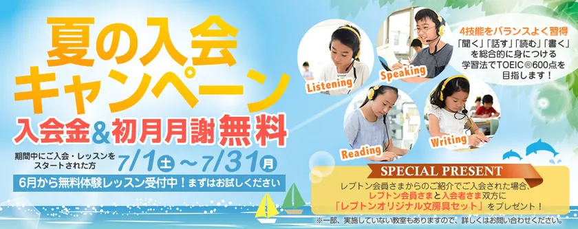子ども英語教室Lepton(レプトン) 6月から無料体験レッスン受付中! 7月限定!入会金&初月月謝が“無料”になる 『夏の入会キャンペーン』を実施