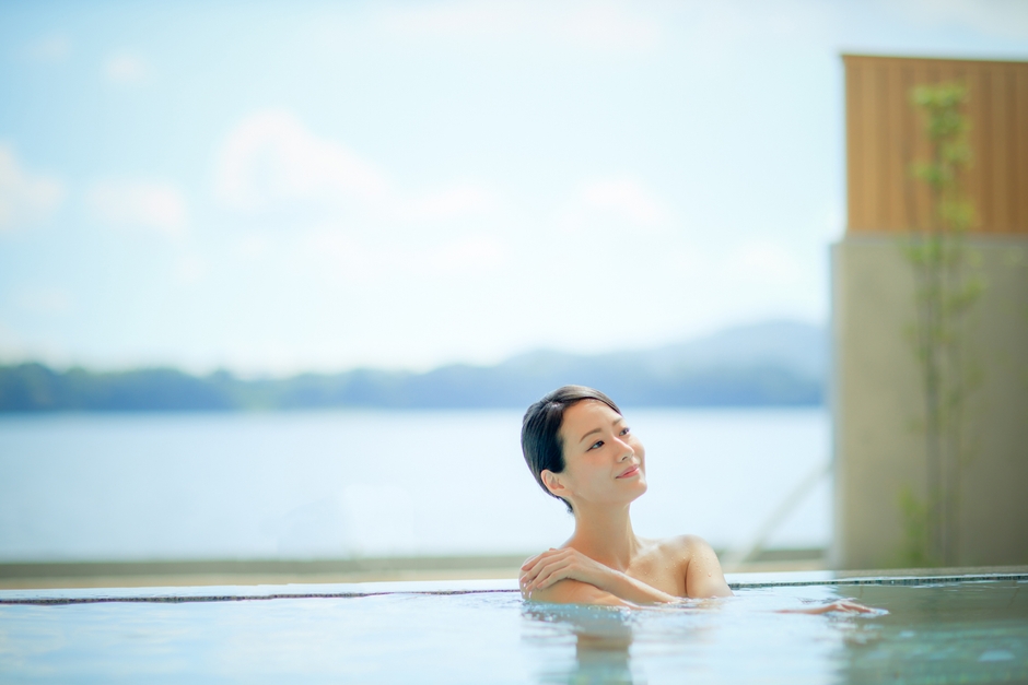 浜名湖が目の前に広がる絶景露天。内湯や、おひとりでゆっくり浸かれる壺湯露天も完備。朝日、夕景で彩りを変える浜名湖ビューをぜひお楽しみください。