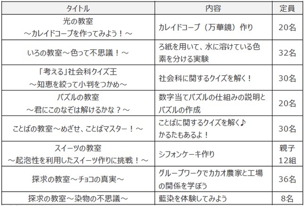 万華鏡づくりにチャレンジする「光の教室」や、起泡性を利用したシフォンケーキ作りに親子で挑戦する「スイーツの教室」など、8種類の体験授業を実施します。また、新たな取り組みとして、課題研究活動を行う「探Qの会」に所属する生徒が主体となり、木綿ハンカチの藍染を体験できる「探求の教室~染物の不思議~」と、カカオ農家と工場の関係について学ぶ「探求の教室~チョコの真実~」を開講します。さらに、校内見学や、保護者向けの入試説明会、希望者を対象とした個別相談会も実施します。