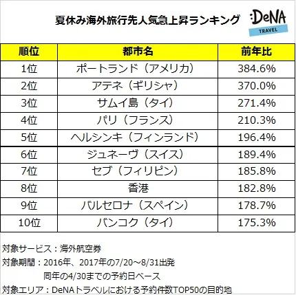 オンライン総合旅行サービス「DeNAトラベル」(http://www.skygate.co.jp)を運営する株式会社DeNAトラベル(本社:東京都新宿区、代表取締役社長:中野 正治)は、夏休みの海外旅行先人気急上昇ランキングを発表します。