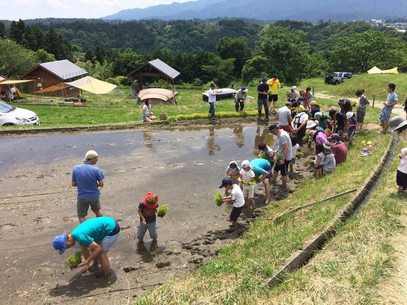 いなかの風キャンプ場は、荒廃する里山の棚田を守り続けることを目的のひとつとして、キャンプを楽しみながら、里山に息づく様々な自然体験や農業体験を提供していく、棚田を活用した本物体験型キャンプ場です。訪れた方に本物の自然を感じてもらうというコンセプトのもと、春から秋にかけて野菜の苗植えや収穫などを体験できますが、その中でも人気の田植え体験イベントは、このイベントのために県外から来場するキャンパーもいるほど。