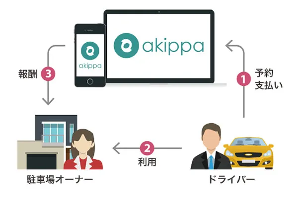 【akippaによる「駐車場のシェアリングサービス」事業スキーム図】