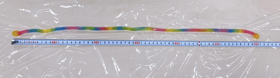 60cmのグミは、5~7歳児の腕の長さ(55~60cm)に合わせて設計。「ちょっと長くて取り出すのが楽しい!」という体験ができるよう工夫しています。また、完成後のグミは引っ張ったり、ねじったり、切ったり、文字をかいたりと、作った後の自由度も抜群です。遊びながらアートを創る感覚が、知育としての側面も持ち合わせています。