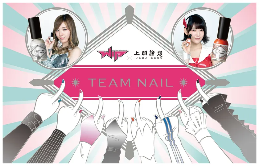 AKB48メンバーが本格的なトレーニングを経て、女子高生プロレスに本格参戦するWIP(ワールド・アイドル・プロレスリング)プロジェクト。そのWIP人気選手8人が自らチョイスしたコスチュームカラーの胡粉ネイルとトップ・ベースコートのクリアカラーがWIP限定ラベルで登場。その中から生まれた「TEAM NAIL」は、みんなでいろんな色のネイルをシェアして使う“シェアネイル”をコンセプトに、速乾が自慢の胡粉ネイルだからできる、新しいネイルの楽しみ方です。試合前にチームメイトでシェアネイルして一致団結したり、週末仲良しグループでシェアネイルしてテーマパークに遊びに出かけたりなど、一緒に「TEAM NAIL」を買って、シェアして、仲間の色を組み合わせてお楽しみいただけます。
