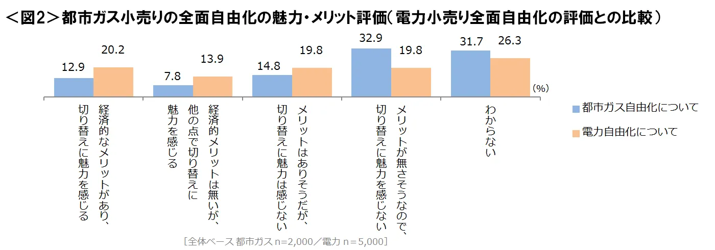 ・制度の魅力・メリットの評価を都市ガス自由化と電力自由化で比較をすると、都市ガスでは「魅力あり」が21%、「魅力なし」が48%となり、電力では「魅力あり」が34%、「魅力なし」が40%となり、都市ガスより電力の方が魅力やメリットを感じられていることがわかった。 <図2>
