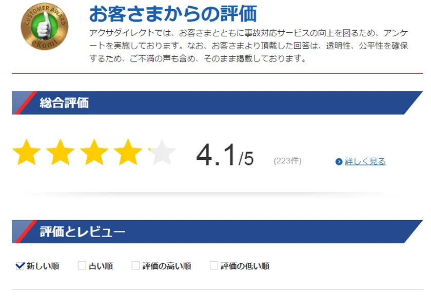 レビュー・評価の調査から公開まで、一連の管理・運営は第三者機関であるeKomi社を通じて行われます。保険契約の締結や保険金請求などの手続きをされた当社のお客さまへ、eKomi社が簡易アンケートをEメールにて直接送付し、ご回答いただいたレビューや評価をアクサダイレクトからの返答とともに、そのまま公開します。