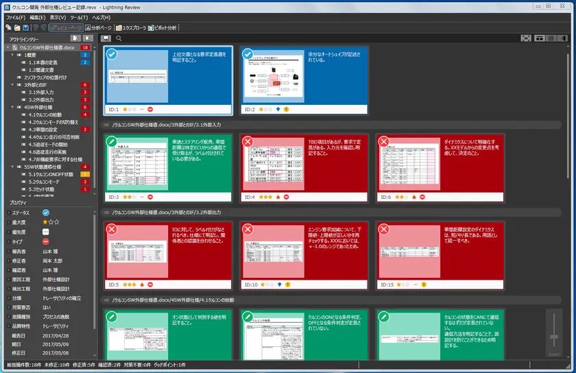 WordやExcel、PowerPoint形式の文書は、文書構造を自動的に解析して管理します。文書内の章や節ごとに、指摘の有無や件数が簡単に見える化できます。