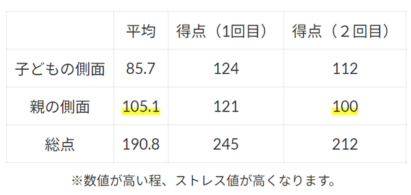 また、親の側面においては、「親の役割によって生じる規制」や「親の健康状態」の項目が特に数値が高かったことから、自分の思い描く育児のようには子どもが言動してくれない為に、親としての役割を担う時間も労力も奪われ、親御さん自身が心身の疲労をきたしている状態でした。
