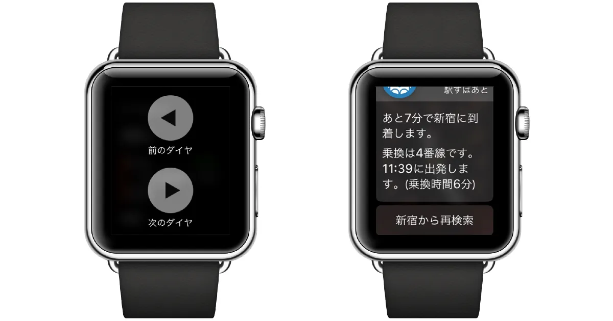 今回の機能拡張により、Apple Watch単体で前後のダイヤを検索・表示することが可能となりました。Apple Watchに表示された経路の画面を深く押すと「前のダイヤ」「次のダイヤ」が表示され、いずれかを押すと前後のダイヤを検索・表示できます。