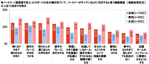 では、好きな人や気になっている人と一緒にスポーツ中継を見るときは、どのようなことに気をつけたほうがよいのでしょうか。全回答者(1,000名)に、パートナーとスポーツの生中継を見ていて、パートナーがやっているとドン引きすると思う観戦態度を聞いたところ、「熱くなりすぎて周りのものを叩く」が最も多く30.7%、ほぼ同率で「選手のプレーに文句をつける」30.4%と「周りの人が驚くほどの大声を出す」30.3%が続き、「選手のプレーに舌打ちする」が29.1%、「興奮しすぎて態度や言葉遣いが乱暴になる」が24.1%となりました。