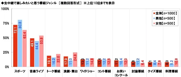 まず、全回答者(1,000名)に、生中継で楽しみたい番組ジャンルを聞いたところ、「スポーツ」が最も多く72.1%、次いで、「音楽ライブ」が49.1%、「トーク番組」が19.1%、「演劇・舞台」が17.9%で続きました。生中継といえば「スポーツ」という人が多いようです。