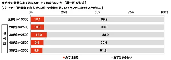 ▼熱くなりすぎには要注意! パートナーとスポーツ中継を見ていてケンカになった 30代では12%が経験