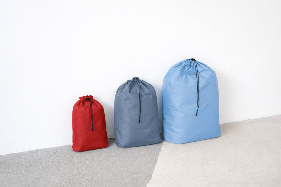STUFF BAGはS・M・Lの3サイズ展開、衣類や小物を用途別に仕分けできるシンプルな巾着型バッグで、キャリーオンバッグとの併用を前提に開発されました。