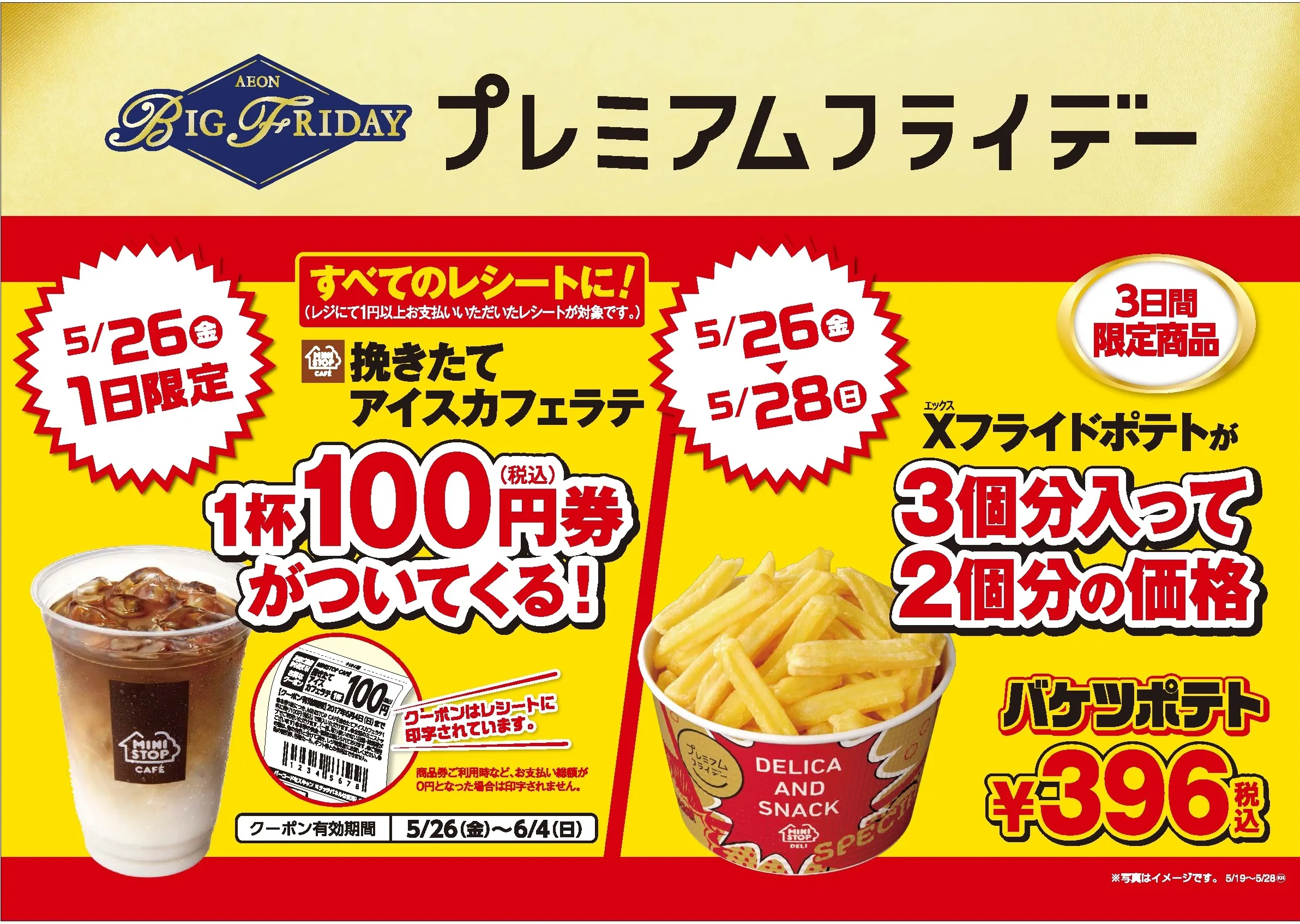 5月のミニストップ「プレミアムフライデー」は “挽きたてアイスカフェラテ”&「バケツポテト」がおトク!!