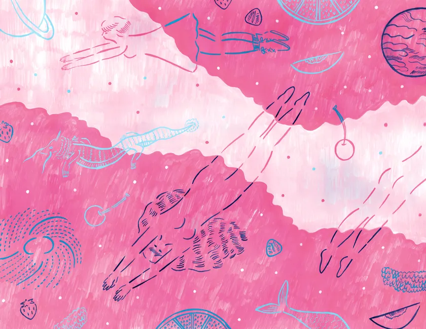 ピンク色の海と東京の街で過ごす日々、空に浮かぶ龍の姿や散らばったフルーツをイメージしたこの夏にぴったりのイラストレーションの作品を展示します。