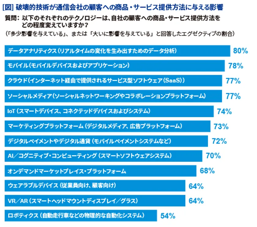 通信業界において「財布のシェア(SOW)」の拡大と顧客満足の向上を目的に顧客体験に重点が置かれる中、通信会社のリーダーたちは、目的を達成するためにさまざまな破壊的技術を採用しています。70%以上の回答者が、データアナリティクス、モバイル、クラウド、ソーシャルメディア、IoT、マーケティングプラットフォーム、デジタルペイメント、AIが、顧客への商品・サービスの提供方法を変えつつあるとしています。