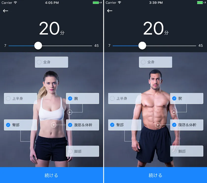 集中的に鍛えたい箇所を、「全身」「上半身」「腕」「臀部」「腹筋+体幹」「脚部」から一つ、または、複数選択することで、部分的に集中トレーニングを行うことができます。また、同じ時間と部位を選択しても、作成されるワークアウトメニューは毎回異なり、飽きることなく運動を継続することが可能です。