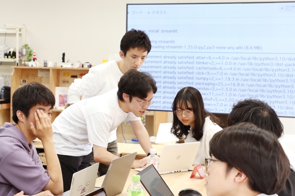 「Streamlit」というウェブアプリを作成する専用ソフトを各自のパソコンにインストールするところから始め、Pythonファイルを作成してコードを実行します。初級者にはかなりハードルが高い内容ですが、それぞれの参加者の進捗を運営メンバーが補助しながら進行。1時間半の勉強会では全員がウェブアプリを動かすところまで達成し、参加者からはPythonを実践的に学ぶことができたという声が上がりました。