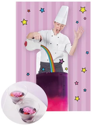 フルーツ入りゼリーの上に、色が変化する不思議な紅茶「マロウブルー※」のシャーベットをのせた夏のデザート。抽出した「マロウブルー」にあるものを入れると、ピンク色に変化!仕上げは、「液体窒素」と混ぜ合わせて出来たてシャーベットの完成です!色の変化や液体窒素などまるで化学実験のよう。お子様の自由研究のネタにも…?