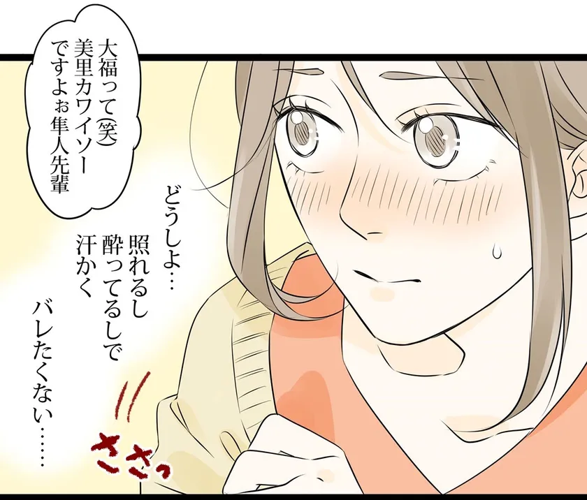 ・憧れの隼人先輩の前ではドキドキして汗ばむ美里。接近チャンスの居酒屋でも汗が気になり、隠すため着こんでしまう。