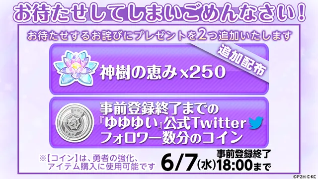 なお、お待たせするお詫びとして、「神樹の恵みx250」及び、事前登録終了までのTwitterのフォロワー数に応じて、コインをプレゼントいたします。